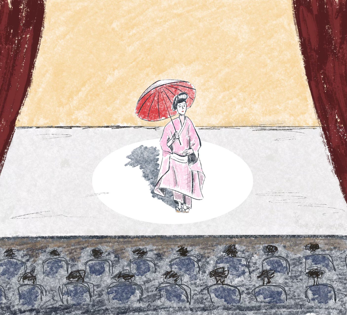 I swear I blacked out on stage. I remember the clacking of my loose geta. My itchy wig. How hot the light felt on my face, plastered in white. The nameless smirks I could faintly make out on the other side of that light, their muffled laughter. My heartbeat. I could hear my heartbeat louder than the song of my dance, as I imagined my peers all squirming with ill-spirited joy in the dark. I didn’t crack though. I finished my scenes, bowed, then skirted offstage, where Mrs. Mendelsohn gave me a hug and said I did beautifully.